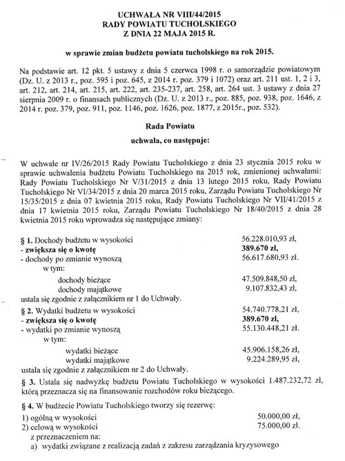 Uchwała Nr VIII/44/2015 Rady Powiatu Tucholskiego z dnia 22 maja 2015 r. w sprawie zmian budżetu powiatu tucholskiego na rok 2015