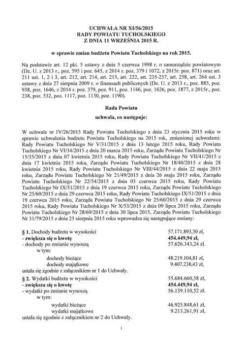 Uchwała nr XI/56/2015 Rady Powiatu Tucholskiego z dnia 11 września 2015 w sprawie zmian budżetu Powiatu Tucholskiego na rok 2015