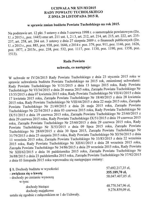 Uchwała nr XIV/83/2015 Rady Powiatu Tucholskiego z dnia 20 listopada 2015 w sprawie zmian budżetu Powiatu Tucholskiego na rok 2015