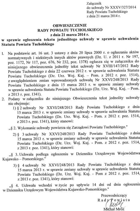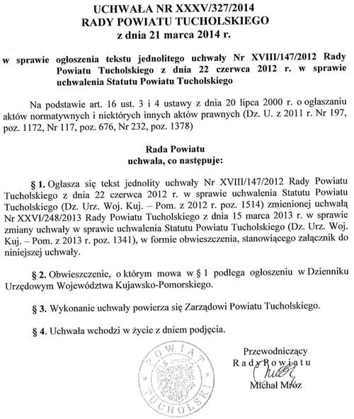 Uchwała Nr XXXV/327/2014 Rady Powiatu Tucholskiego z dnia 21 marca 2014 r. w sprawie ogłoszenia tekstu jednolitego uchwały Nr XVIII/147/2012 Rady Powiatu Tucholskiego z dnia 22 czerwca 2012 r. w sprawie uchwalenia Statutu Powiatu Tucholskiego