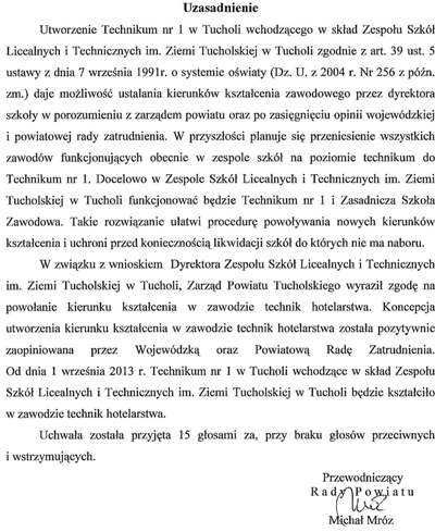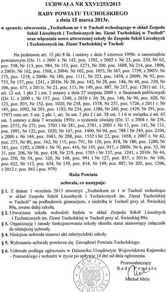 Uchwała Nr XXVI/253/2013 Rady Powiatu z dnia 15.03.2013 r. w sprawie utworzenia ,,Technikum nr 1 w Tucholi wchodzącego w skład ZSLiT im. Ziemi Tucholskiej w Tucholi" oraz włączenia nowo utworzonej szkoły do ZSLiT im. Ziemi Tucholskiej w Tucholi