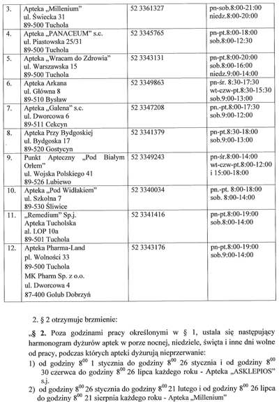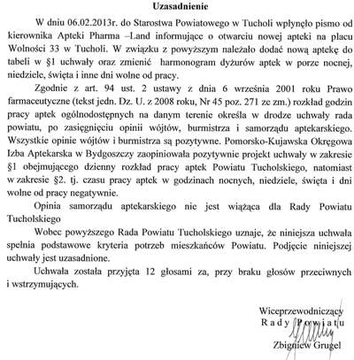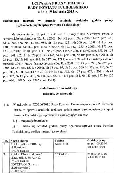 Uchwała Nr XXVII/261/2013 Rady Powiatu z dnia 19.04.2013 r. zmieniająca uchwałę w sprawie ustalenia rozkładu godzin pracy ogólnodostępnych aptek Powiatu Tucholskiego