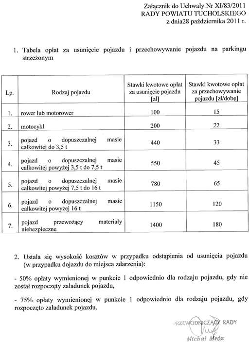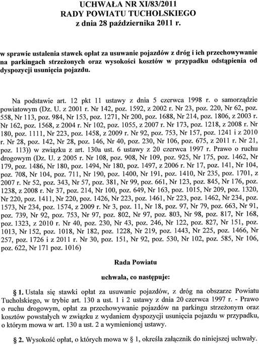 Uchwała Nr XI/83/2011 Rady Powiatu Tucholskiego z dnia 28 października 2011 r. w sprawie ustalenia stawek opłat za usuwanie pojazdów z dróg i ich przechowywanie na parkingach strzeżonych...