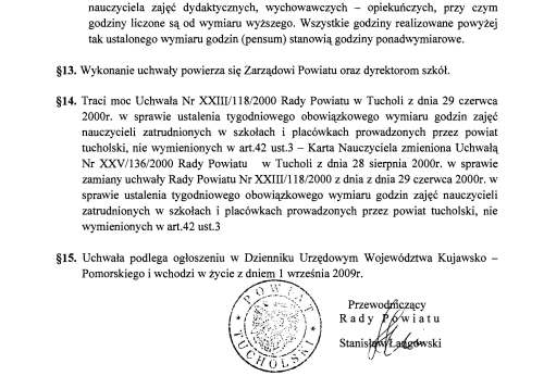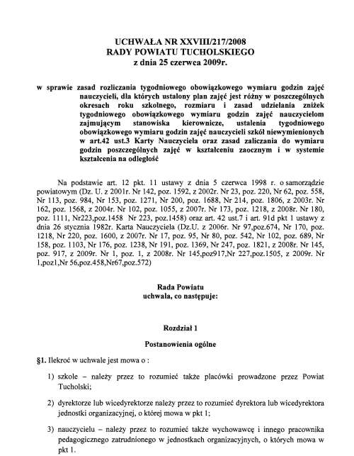 Uchwała nr XXVIII/217/2009 Rady Powiatu Tucholskiego z dnia 25 czerwca 2009 w sprawie zasad rozliczania tygodniowego obowiązkowego wymiaru godzin zajęć nauczycieli, dla których ustalony plan zajęć jest różny w poszczególnych okresach roku szkol