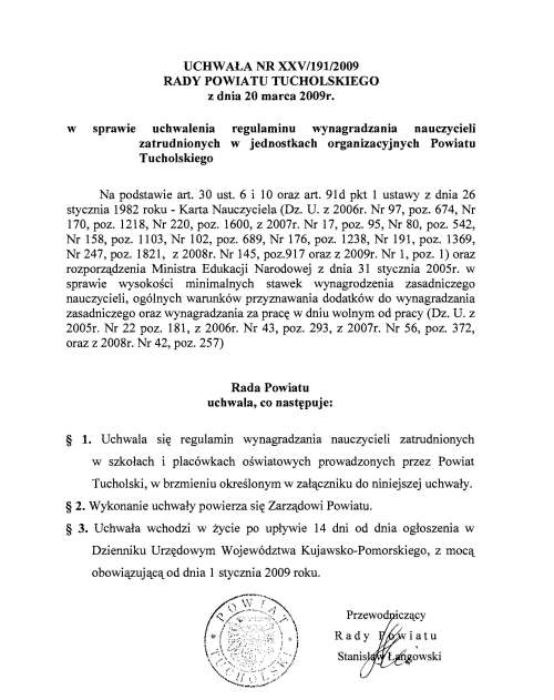 Uchwała nr XXV/191/2009 Rady Powiatu Tucholskiego z dnia 20 marca 2009 w sprawie uchwalenia regulaminu wynagradzania nauczycieli zatrudnionych w jednostkach organizacyjnych Powiatu Tucholskiego