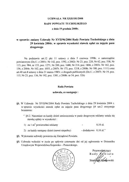 Uchwała nr XXII/181/2008 Rady Powiatu Tucholskiego z dnia 19 grudnia 2008 w sprawie zmiany uchwały nr XVII/96/2004 Rady Powiatu Tucholskiego z dnia 29 kwietnia 2004 r. w sprawie wysokości stawek opłat za zajęcie pasa drogowego
