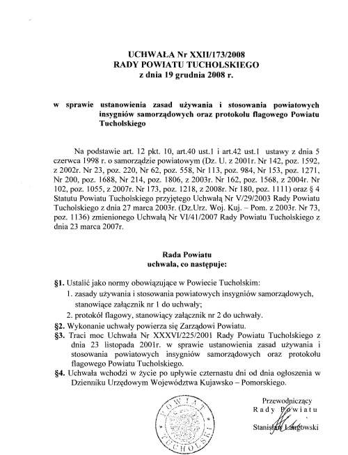 Uchwała nr XXII/173/2008 Rady Powiatu Tucholskiego z dnia 19 grudnia 2008 w sprawie ustanowienia zasad używania i stosowania powiatowych insygniów samorządowych oraz protokołu flagowego Powiatu Tucholskiego