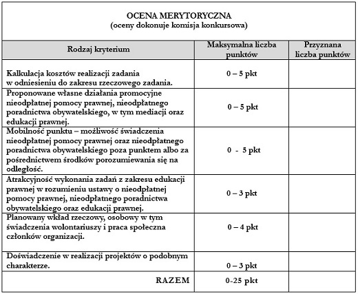 6. Organizacja zapewni materiały biurowe i druki oświadczeń do obsługi nieodpłatnej pomocy prawnej lub świadczenia poradnictwa obywatelskiego.