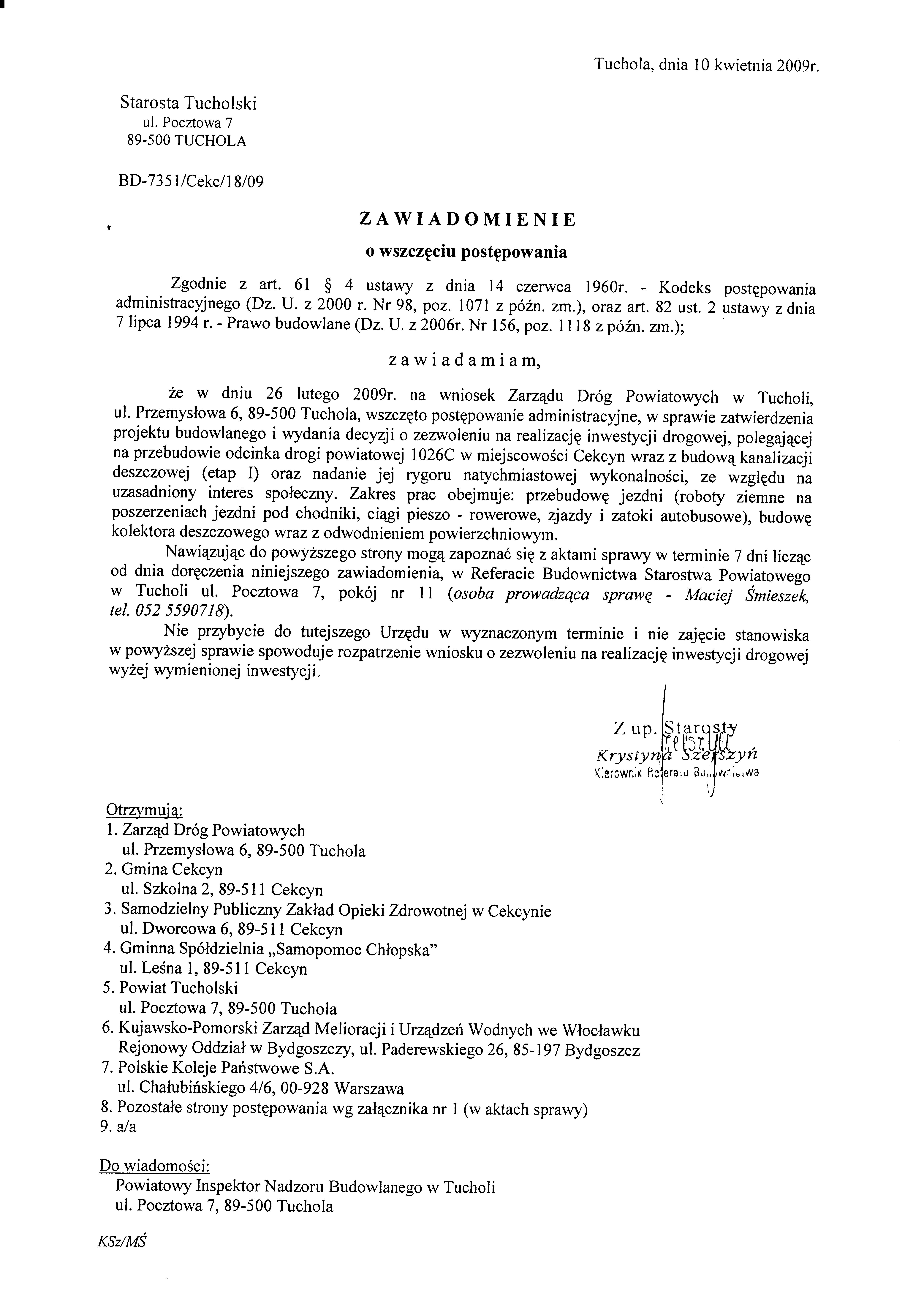 że w dniu 26 lutego 2009r. na wniosek Zarządu Dróg Powiatowych w Tucholi, ul. Przemysłowa 6, 89-500 Tuchola, wszczęto postępowanie administracyjne, w sprawie zatwierdzenia projektu budowlanego i wydania decyzji o zezwoleniu na realizację inwestycji drogowej, polegającej na przebudowie odcinka drogi powiatowej 1026C w miejscowości Cekcyn wraz z budową kanalizacji deszczowej (etap I) oraz nadanie jej rygoru natychmiastowej wykonalności, ze względu na uzasadniony interes społeczny. Zakres prac obejmuje: przebudowę jezdni (roboty ziemne na poszerzeniach jezdni pod chodniki, ciągi pieszo - rowerowe, zjazdy i zatoki autobusowe), budowę kolektora deszczowego wraz z odwodnieniem powierzchniowym.