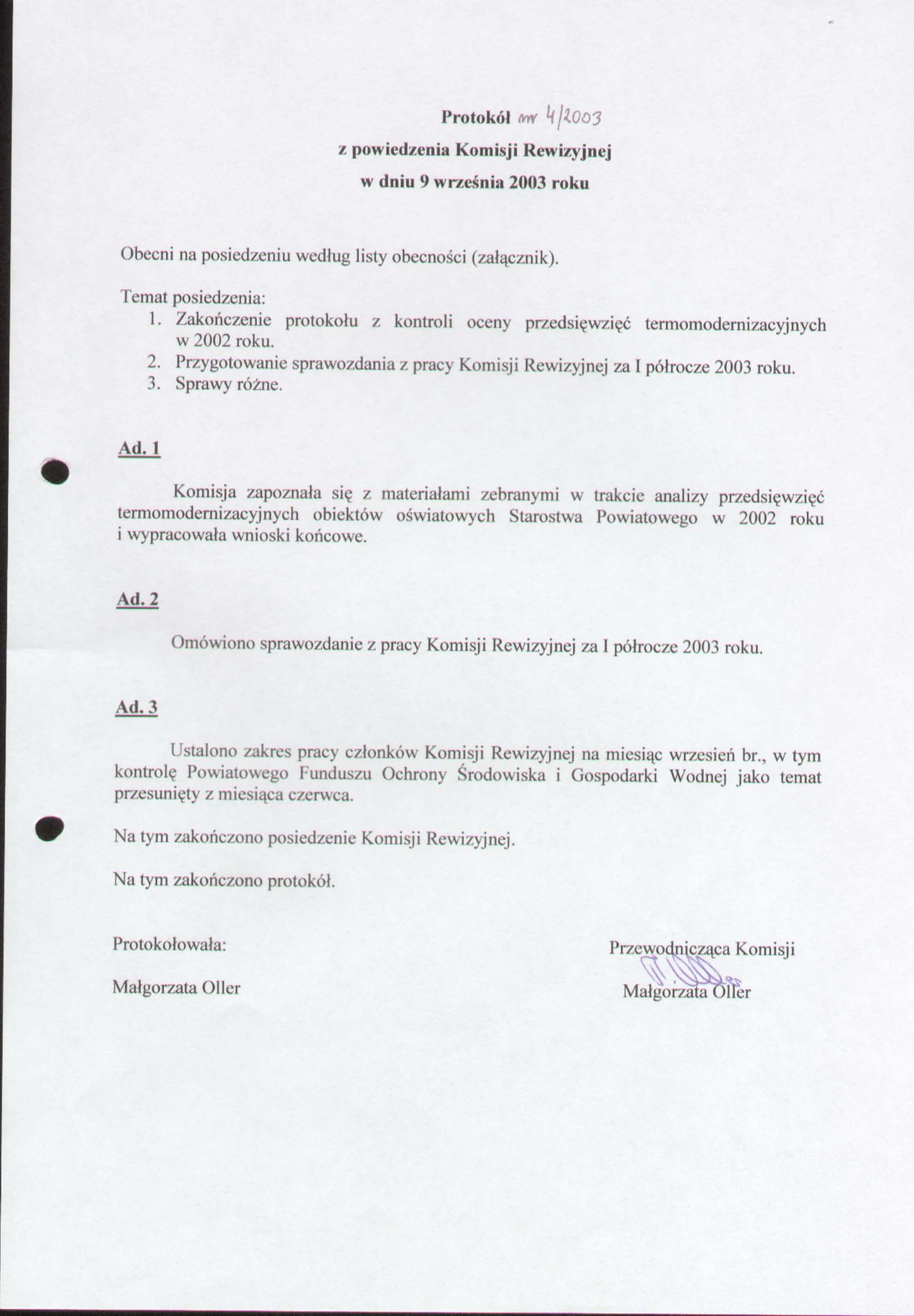 Protokół nr 4/2003 z posiedzenia Komisji Rewizyjnej odbytego dnia 9 września 2003 r.